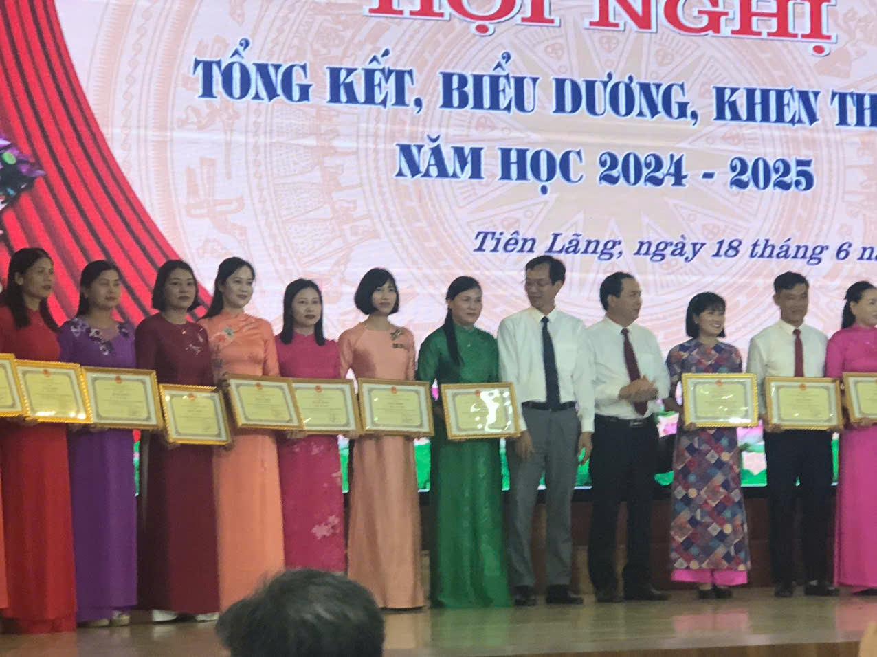 Hình ảnh GV nhận bằng khen của Chủ tịch UBND thành phố tại Hội nghị tổng kết năm học 2024-2025