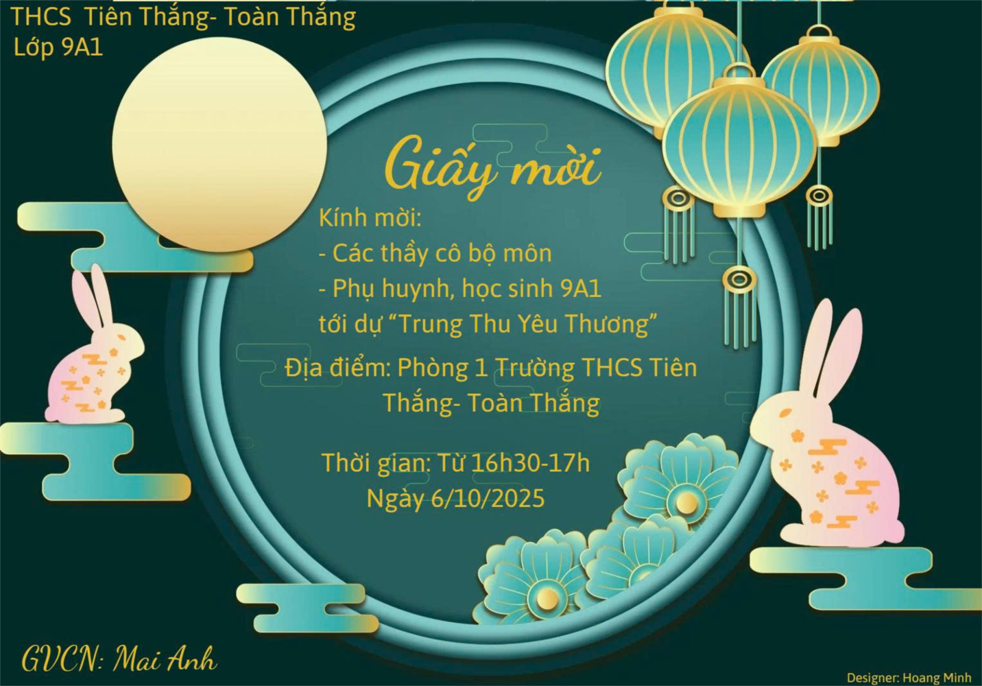 Hòa trong không khí rộn ràng của ngày Tết Trung thu, lớp 9A1 đã tổ chức một buổi sinh hoạt đầy ý nghĩa vào chiều ngày 14 tháng 8 âm lịch. Lớp học được trang trí rực rỡ với đèn lồng, bóng bay và mâm cỗ trung thu do chính các bạn học sinh cùng nhau chuẩn bị. Chương trình có nhiều hoạt động hấp dẫn như thi làm lồng đèn, đố vui, múa lân và biểu diễn văn nghệ. Những tiếng cười giòn giã vang khắp lớp khi mọi người cùng tham gia các trò chơi và chia sẻ bánh kẹo, trái cây. Buổi sinh hoạt giúp các bạn hiểu hơn về ý nghĩa ngày Tết thiếu nhi, đồng thời thắt chặt tinh thần đoàn kết, mang lại kỷ niệm đáng nhớ cho tập thể 9A1.
